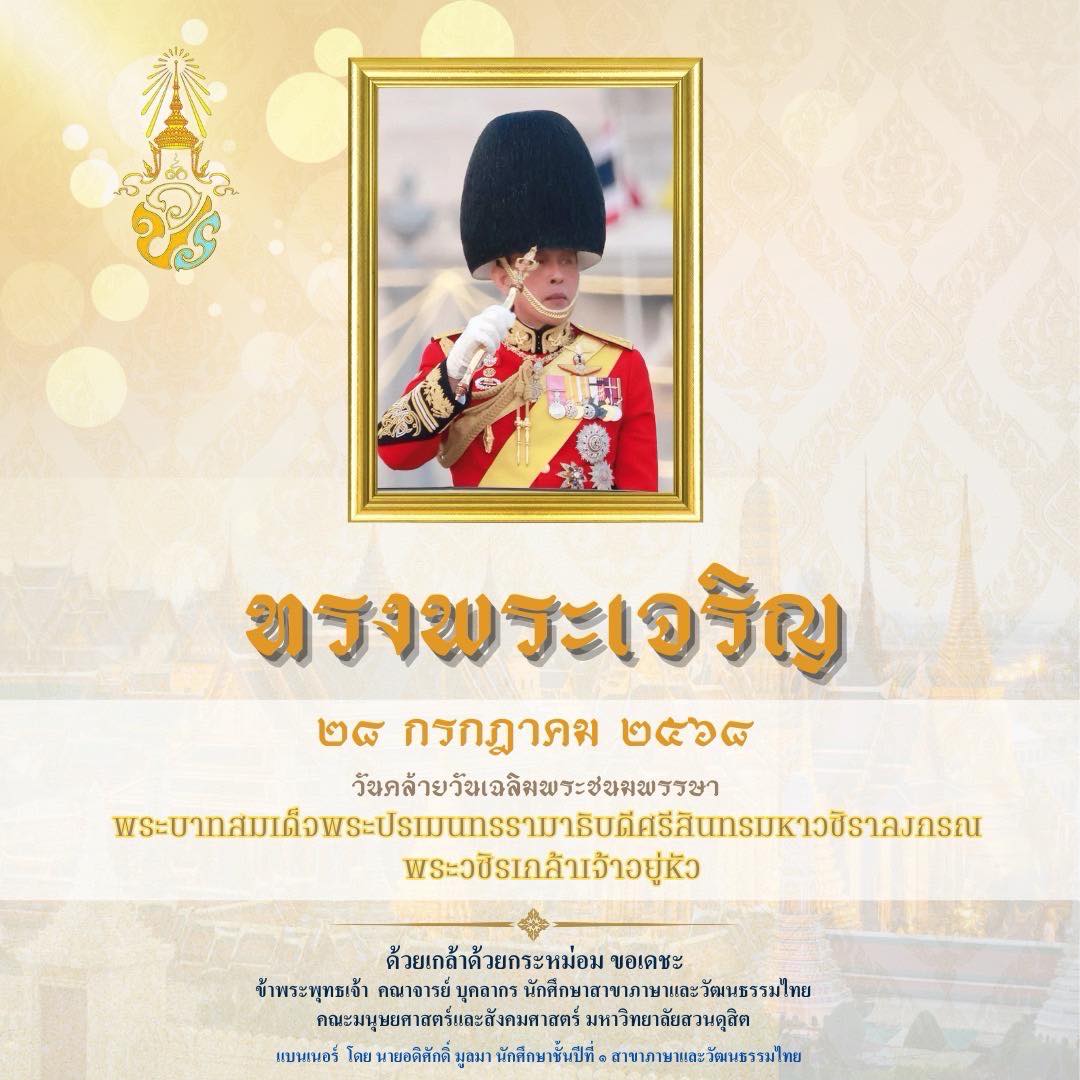 ทรงพระเจริญ๒๘ กรกฎาคม ๒๕๖๘วันคล้ายวันเฉลิมพระชนมพรรษาพระบาทสมเด็จพระปรเมนทรรามาธิบดีศรีสินทรมหาวชิราลงกรณพระวชิรเกล้าเจ้าอยู่หัว