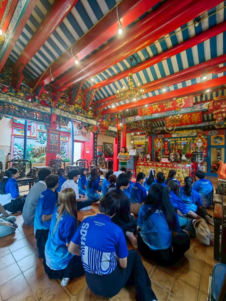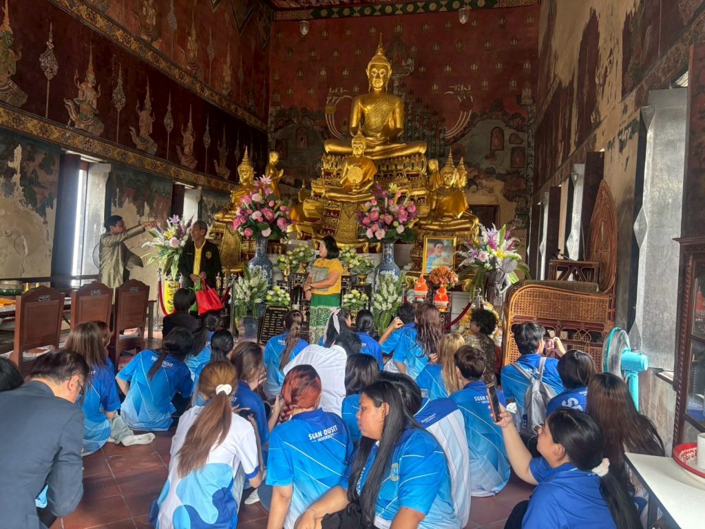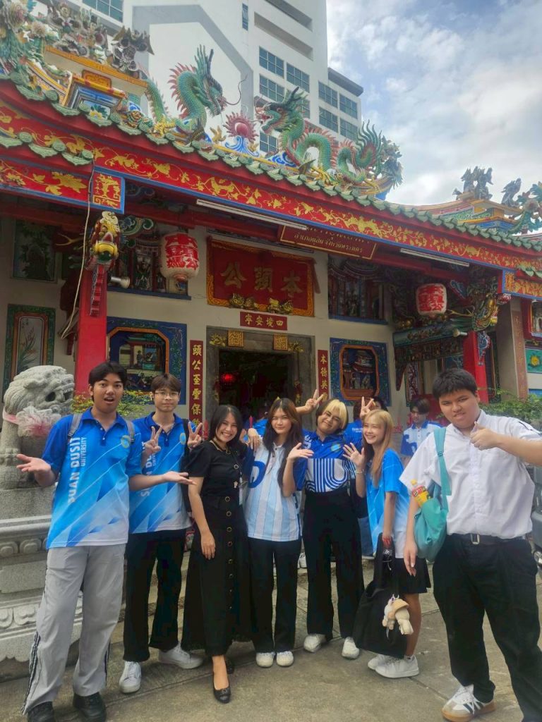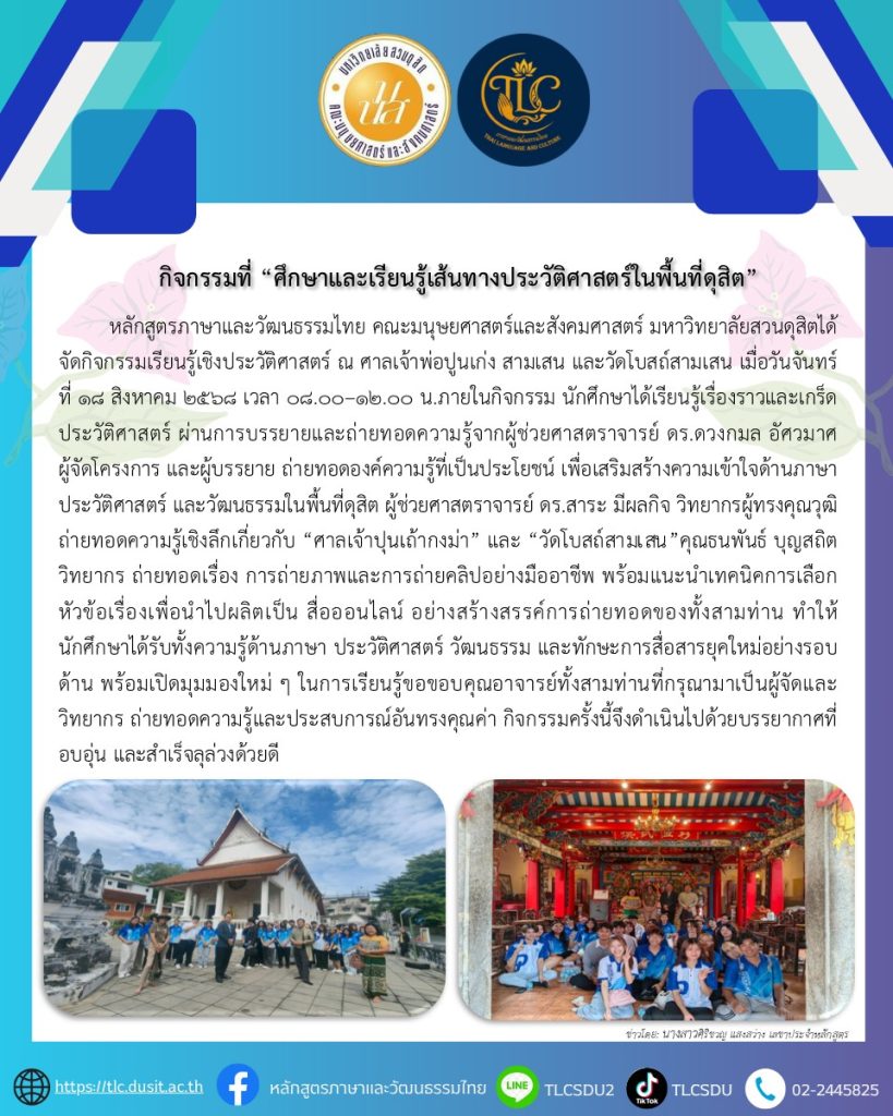 หลักสูตรภาษาและวัฒนธรรมไทย คณะมนุษยศาสตร์และสังคมศาสตร์ มหาวิทยาลัยสวนดุสิตได้จัดกิจกรรมเรียนรู้เชิงประวัติศาสตร์ ณ ศาลเจ้าพ่อปูนเก่ง สามเสน และวัดโบสถ์สามเสน เมื่อวันจันทร์ที่ 18 สิงหาคม 2568 เวลา 08.00–12.00 น. ภายในกิจกรรม นักศึกษาได้เรียนรู้เรื่องราวและเกร็ดประวัติศาสตร์ ผ่านการบรรยายและถ่ายทอดความรู้จาก ผู้ช่วยศาสตราจารย์ ดร.ดวงกมล อัศวมาศ ผู้จัดโครงการ และผู้บรรยาย ถ่ายทอดองค์ความรู้ที่เป็นประโยชน์ เพื่อเสริมสร้างความเข้าใจด้านภาษา ประวัติศาสตร์ และวัฒนธรรมในพื้นที่ดุสิต ผู้ช่วยศาสตราจารย์ ดร.สาระ มีผลกิจ วิทยากรผู้ทรงคุณวุฒิ ถ่ายทอดความรู้เชิงลึกเกี่ยวกับ “ศาลเจ้าปุนเถ้ากงม่า” และ “วัดโบสถ์สามเสน” คุณธนพันธ์ บุญสถิต วิทยากร ถ่ายทอดเรื่อง การถ่ายภาพและการถ่ายคลิปอย่างมืออาชีพ พร้อมแนะนำเทคนิคการเลือกหัวข้อเรื่องเพื่อนำไปผลิตเป็น สื่อออนไลน์ อย่างสร้างสรรค์ การถ่ายทอดของทั้งสามท่าน ทำให้นักศึกษาได้รับทั้งความรู้ด้านภาษา ประวัติศาสตร์ วัฒนธรรม และทักษะการสื่อสารยุคใหม่อย่างรอบด้าน พร้อมเปิดมุมมองใหม่ ๆ ในการเรียนรู้ ขอขอบคุณอาจารย์ทั้งสามท่านที่กรุณามาเป็นผู้จัดและวิทยากร ถ่ายทอดความรู้และประสบการณ์อันทรงคุณค่า กิจกรรมครั้งนี้จึงดำเนินไปด้วยบรรยากาศที่อบอุ่น และสำเร็จลุล่วงด้วยดี