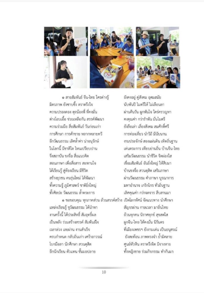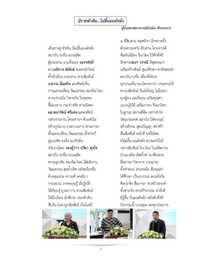 “นิราศหัวหินไม่สิ้นมนต์ขลัง” ประพันธ์โดย ผศ.สำเนียง ฟ้ากระจ่าง สาขาภาษาและวัฒนธรรมไทย คณะมนุษยศาสตร์และสังคมศาสตร์ หนึ่งในคณะกรรมการจัดทำ โครงการสารานุกรมไทยสำหรับเยาวชน โดยมีสมเด็จพระกนิษฐาธิราชเจ้า กรมสมเด็จพระเทพรัตนราชสุดา สยามบรมราชกุมารี เป็นองค์ประธานที่ปรึกษา กับบทสรุปกิจกรรม “หัวหินไม่สิ้นมนต์ขลังฯ” ของสถาบันขงจื่อ มหาวิทยาลัยสวนดุสิต สุพรรณบุรี ตามแบบฉันทลักษณ์ “นิราศ” โดยมี รศ.พัชรี สวนแก้ว รองอธิการบดีฝ่ายกิจการนักศึกษา เป็นผู้รับผิดชอบโครงการฯ ดำเนินการและประสานงานโครงการฯ โดย ผศ.ดร.สาระ มีผลกิจ สาขาสหวิทยาการการท่องเที่ยว ประธานฝ่ายทำนุบำรุงศิลปวัฒนธรรมและวัฒนธรรม โรงเรียนการท่องเที่ยวและการบริการ มหาวิทยาลัยสวนดุสิต