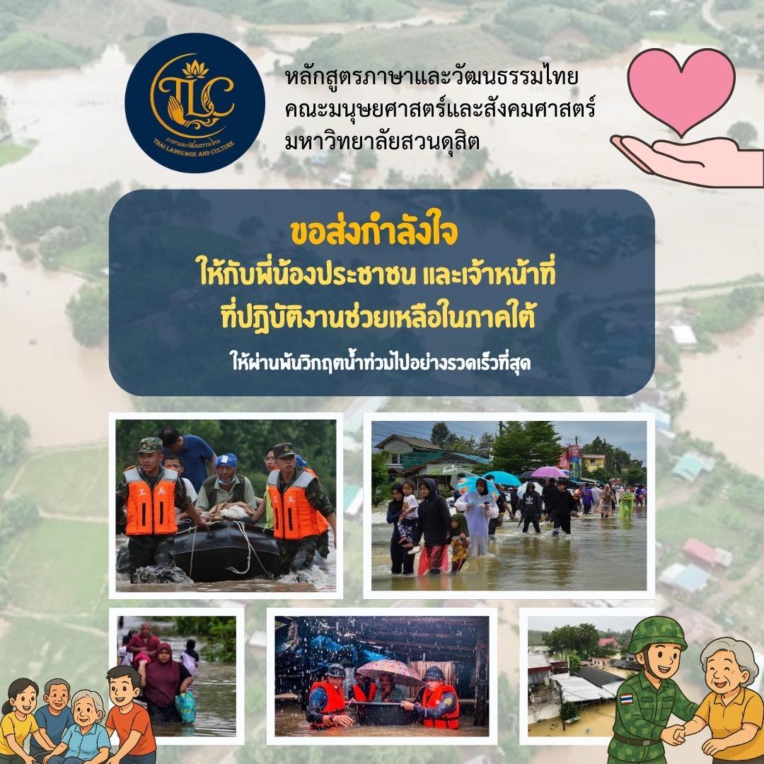 หลักสูตรภาษาเเละวัฒนธรรมไทย ขอส่งกำลังใจให้กับพี่น้องประชาชน และเจ้าหน้าที่ปฎิบัติงานช่วยเหลือในภาคใต้ให้ผ่านพ้นไปโดยเร็ว