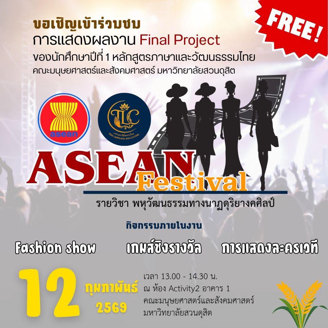All | ข่าวกิจกรรมด้านทำนุบำรุงศิลปวัฒนธรรม | ข่าวกิจกรรมนักศึกษา เชิญชวนเข้าร่วม กิจกรรม “ASEAN Festival” เปิดเวทีสร้างสรรค์เรียนรู้พหุวัฒนธรรมอาเซียน ByTLC February 12, 2026February 13, 2026