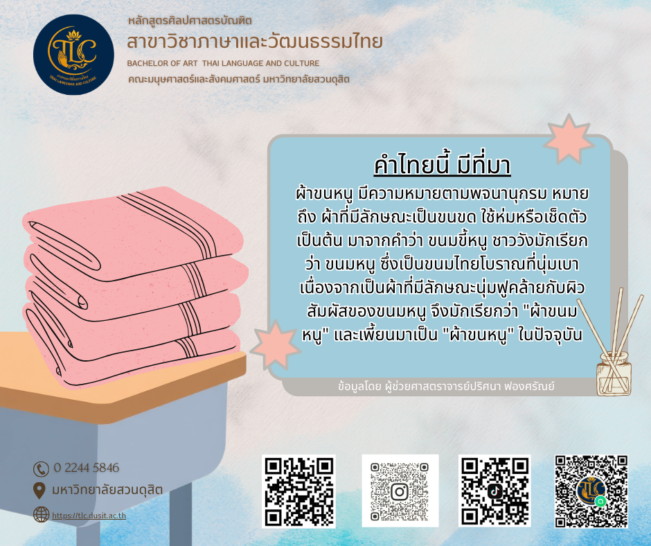 All | ข่าวการบริการวิชาการ | ข่าวกิจกรรมด้านทำนุบำรุงศิลปวัฒนธรรม | ข่าวด้านวิชาการ คำไทยนี้ มีที่มา วันนี้ขอเสนอเรื่อง… “ผ้าขนหนู” ByTLC February 17, 2026February 18, 2026